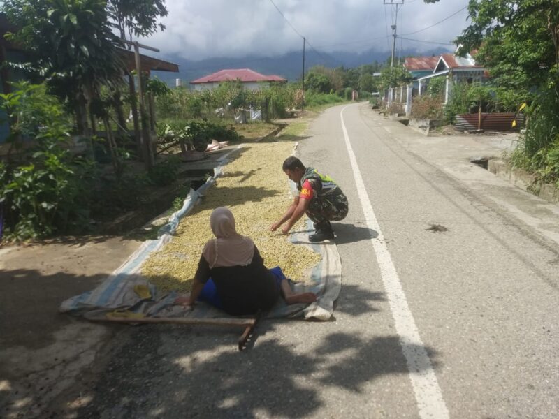 Babinsa Koramil 08/Blangpegayon Kodim 0113/ Gayo lues Koptu Karmadi membantu warga binaanya menjemur biji kopi di Desa porang Ayu Kecamatan Blangpegayon Kabupaten Gayo lues.