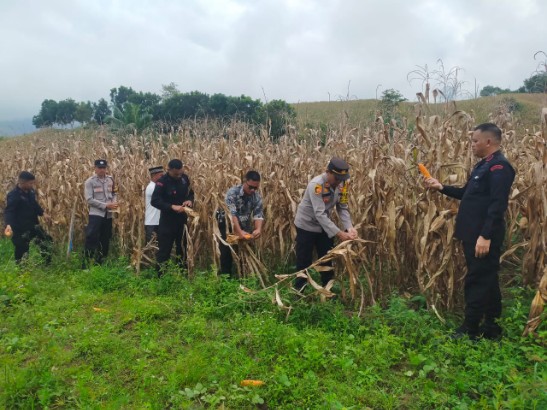 GAYO LUES – Brimob Aceh Panen Jagung Perdana Sebagai Wujud Mendukung Program Ketahanan Pangan