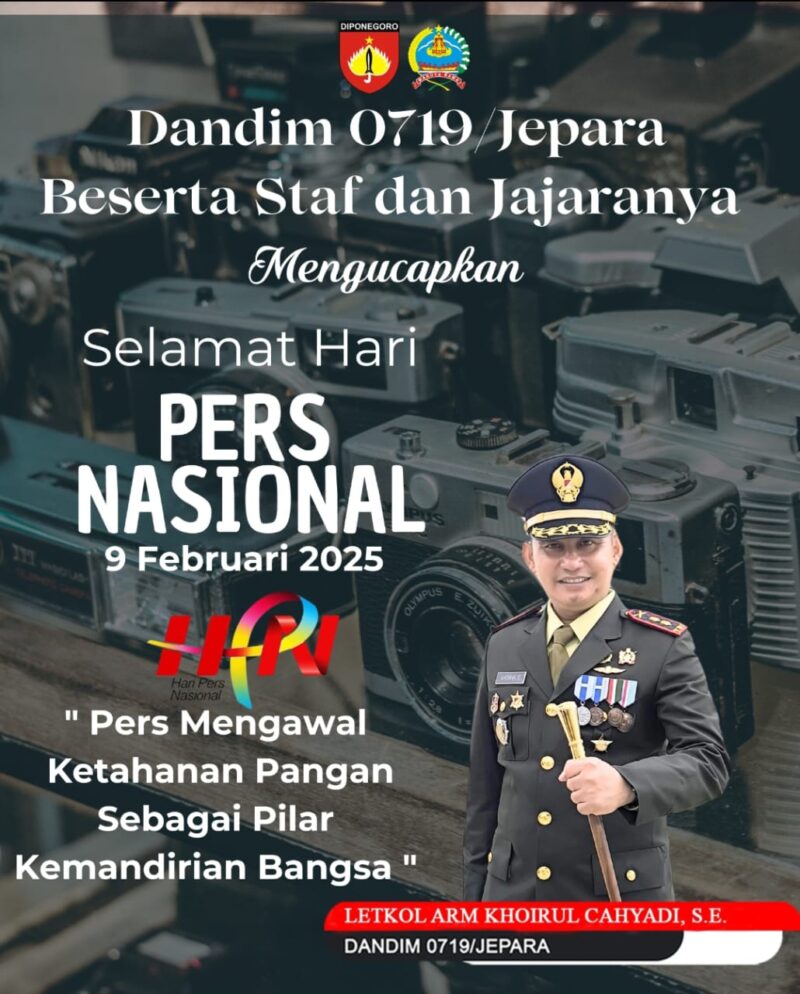 Jepara, 8-2-2025 – Komandan Kodim 0719/Jepara, Letkol Arm Khoirul Cahyadi, S.E., mengucapkan Selamat Hari Pers Nasional (HPN) 2025 kepada seluruh insan pers di Indonesia, khususnya yang bertugas di wilayah Jepara dan sekitarnya.