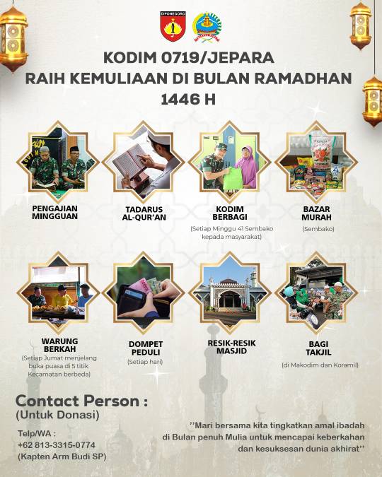 Bagi masyarakat yang ingin meraih kemuliaan bersama Kodim 0719/Jepara dengan berdonasi bisa menghubungi : Kapten Arm Budi SP. di nomor 0813-3315-0774.