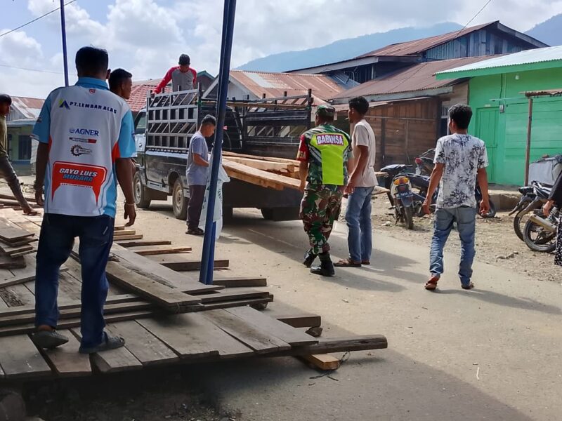 Koramil 08/Blangpegayon, Dukung dalam pemasangan dan pembuatan teratak dalam rangka hajatan warga binaan, serta meningkatkan hubungan yang erat terhadap warga binaannya, Babinsa Koramil 08/BP, Serda Joko Purnomo melaksanakan gotong royong bersama warga membantu pembuatan teratak yang terletak di Desa Tetinggi, Kec. Blangpegayon, Kab. Gayo Lues. Kamis (13/02/2025).
