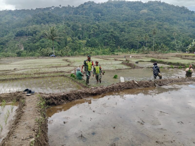 Pining – Bintara Pembina Desa (Babinsa) Koramil 05/Pining , Kodim 0113/Gayo Lues, Sertu Ali Naksabandi beserta sertu idinsyah melaksanakan kegiatan hanpangan atau pendampingan kepada warga binaan dalam kegiatan pertanian dengan membantu menanam tanaman Padi di Desa Pertik, Kecamatan Pining, Kabupaten Gayo Lues, Sabtu (17/02/2025).