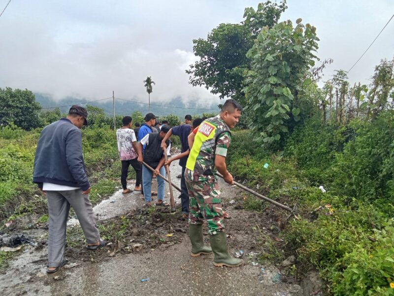 Babinsa Koramil 07/Blangjerango Kopda Rian bersama masyarakat melaksanakan gotong royong pembersihan ruas kanan kiri jalan di desa Ketukah Kecamatan Blangjerango, Kab. Gayo Lues, Minggu (23/02/2025).
