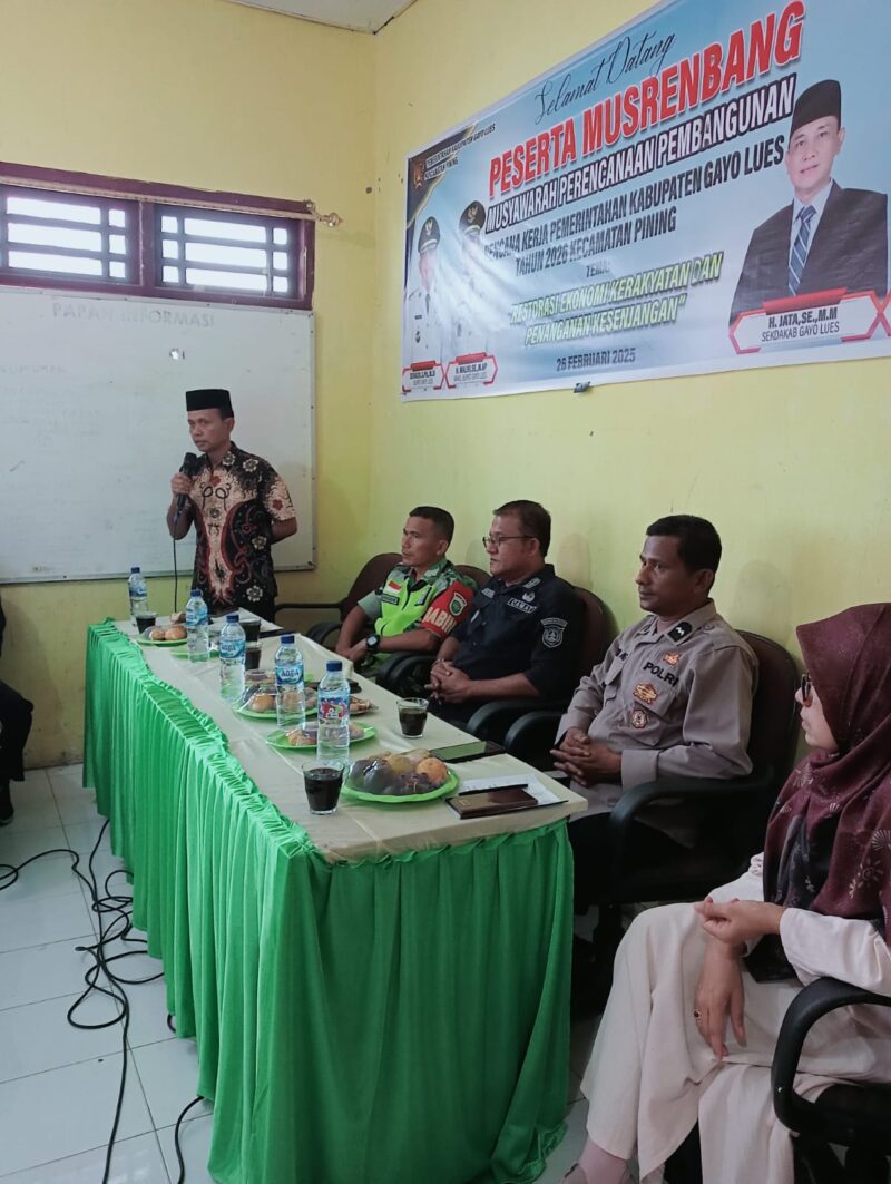 Babinsa Koramil 05/Png Kodim 0113/Gayo Lues Sertu Ali Naksabandi menghadiri undangan Musyawarah Rencana Pembangunan Kecamatan dalam rangka Penyusunan rencana Kerja Pemerintah Kecamatan tahun 2025, di Aula kantor Camat Pining, Rabu (26/02/2025).