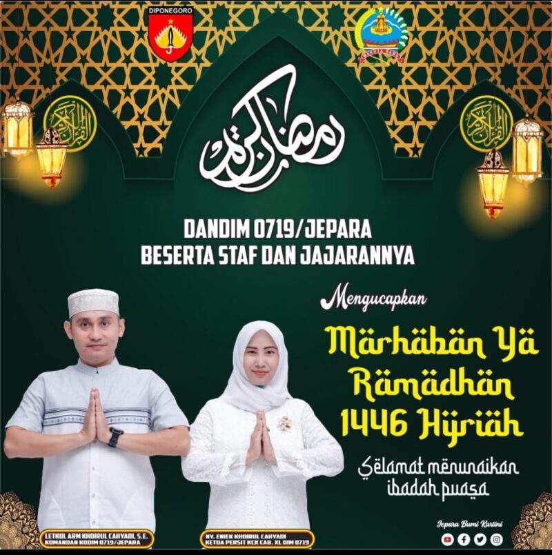 Jepara, 28 Februari 2025 – Menyambut datangnya bulan suci Ramadhan 1446 H, Komandan Kodim 0719/Jepara, Letkol Arm Khoirul Cahyadi, S.E., bersama seluruh jajaran Kodim 0719/Jepara mengucapkan “Marhaban Ya Ramadhan” kepada seluruh umat Muslim di Kabupaten Jepara. Dalam pernyataan resmi yang disampaikan, Letkol Khoirul mengajak masyarakat untuk memanfaatkan bulan penuh berkah ini sebagai kesempatan untuk meningkatkan amal ibadah dan memperkuat rasa kebersamaan.