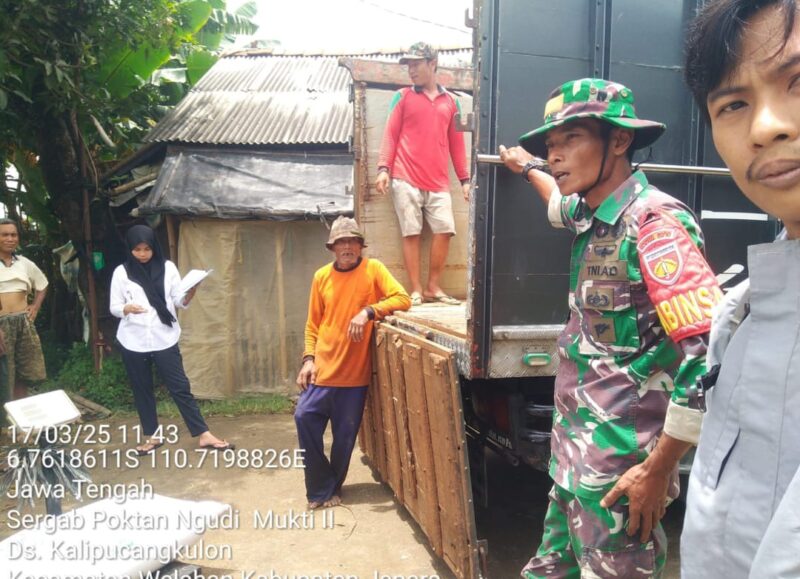 Jepara 17-3-2025 – Babinsa Kodim 0719/Jepara, Sertu Heri Purwanto, yang bertugas sebagai anggota Koramil 06/Welahan, bersama dengan Penyuluh Pertanian Lapangan (PPL) Kecamatan Welahan, Ali Yafi, melaksanakan pendampingan terhadap hasil panen gabah di Desa Kalipucang Kulon, Kecamatan Welahan, Kabupaten Jepara. Kegiatan ini juga melibatkan Bulog yang menyerap hasil panen gabah milik kelompok tani (Poktan) Ngudi Mukti.