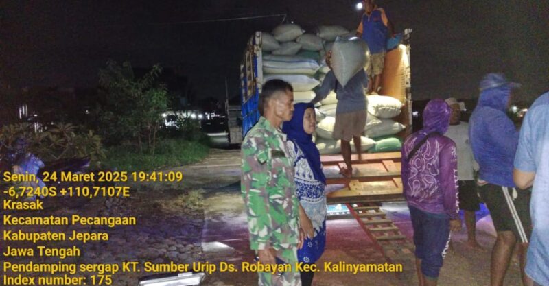 Jepara 25-3-2025– Dalam rangka mendukung program Pemerintah dalam upaya penyerapan gabah petani, Babinsa Kodim 0719/Jepara, Koptu Edy Suyanto, melaksanakan pendampingan kegiatan Penyerapan Gabah (SERGAB) yang bekerja sama dengan Bulog dan Penyuluh Pertanian Lapangan (PPL) di lahan milik Bapak Giarto, Bapak Wawan, Bapak Sholikan, dan Bapak Maslikan, Desa Sendang RT.03 RW.03, Kecamatan Kalinyamatan, Kabupaten Jepara, pada Senin (24/3).