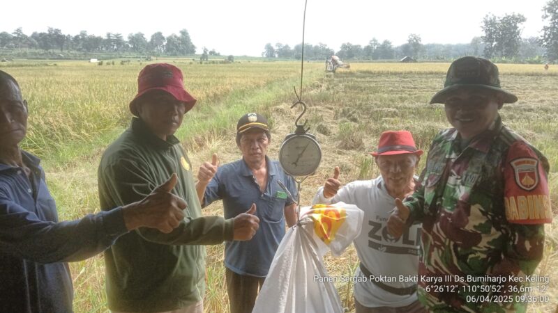 Jepara, 6 April 2025 – Dalam upaya mendukung program ketahanan pangan dan meningkatkan kesejahteraan petani, Babinsa Desa Bumiharjo, Kodim 0719/Jepara, Sertu Nanang Julianto, bersama dengan Ketua Kelompok Penyelenggara Penyuluh Lapangan (KPPL) Kecamatan Keling, Ir. Mulyono, serta Ketua Kelompok Tani Bakti Karya 3, H. Tajab, melaksanakan kegiatan pendampingan petani pada saat panen padi di persawahan Blok Sumbang, Desa Bumiharjo, Kecamatan Keling, Kabupaten Jepara.