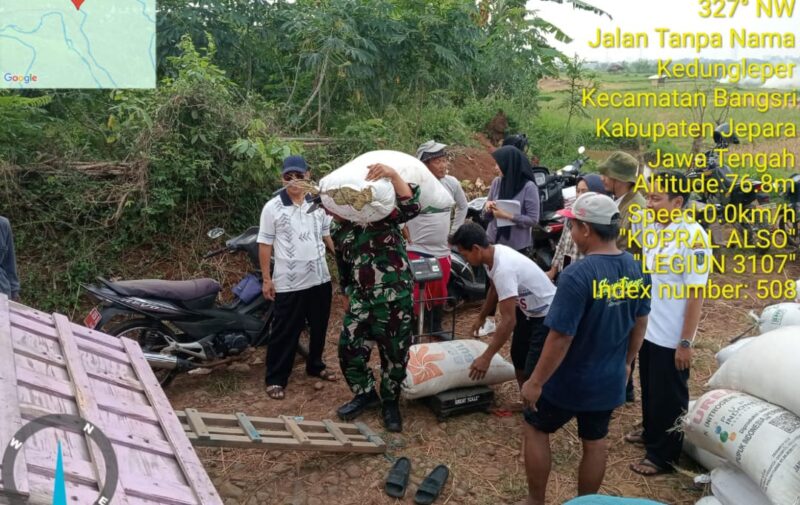 Jepara 16-4-2025– Babinsa Desa Kedungleper, Koptu Ali Sodikin, anggota Koramil 07/Bangsri Kodim 0719/Jepara, melaksanakan kegiatan pendampingan Serapan Gabah (Sergab) oleh Bulog terhadap hasil panen milik petani lokal di Desa Kedungleper, Kecamatan Bangsri, Kabupaten Jepara, Rabu (16/4).