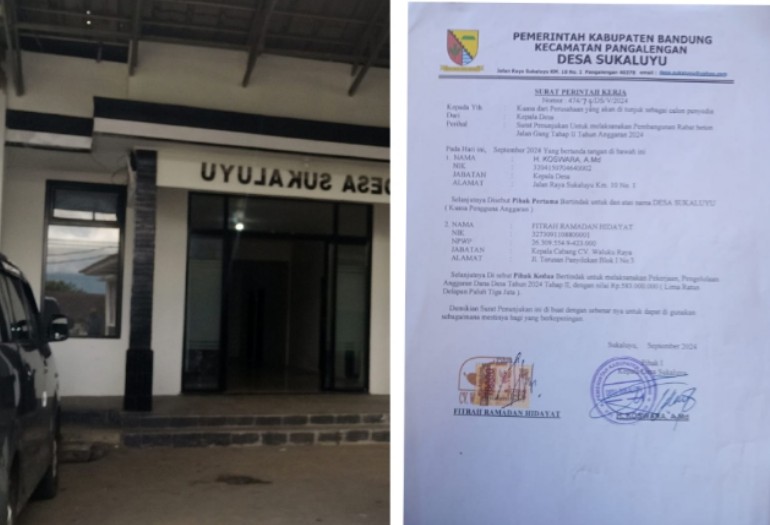 Yang menjadi sorotan, SPK tersebut menggunakan kop surat resmi Desa Sukaluyu dan mencantumkan logo Kabupaten Bandung, seolah memberikan legitimasi resmi dari pemerintah desa. Dokumen itu ditandatangani langsung oleh Kepala Desa Sukaluyu sebagai pihak pertama dan Kepala Cabang CV Waluku Raya sebagai pihak kedua, lengkap dengan cap desa dan materai resmi.