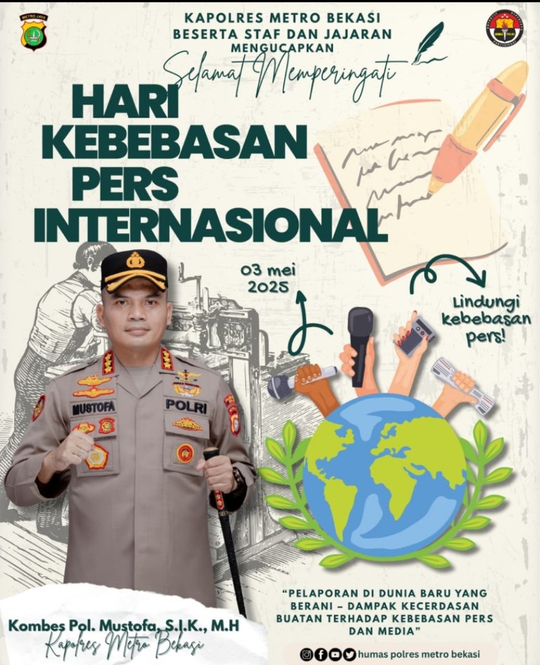 Dalam poster yang dirilis oleh Humas Polres Metro Bekasi, ditampilkan simbol-simbol jurnalistik seperti pena, mikrofon, dan kamera, serta ajakan untuk melindungi kebebasan pers sebagai bentuk penghormatan terhadap hak asasi manusia dan transparansi publik.