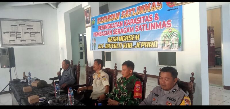 Babinsa Desa Ngasem, Koptu Ariyadi dari Koramil 03/Batealit, Kodim 0719 menghadiri kegiatan Peningkatan Kapasitas dan Pembagian Seragam Satlinmas yang diselenggarakan di Balaidesa Ngasem, Kecamatan Batealit, Kabupaten Jepara.