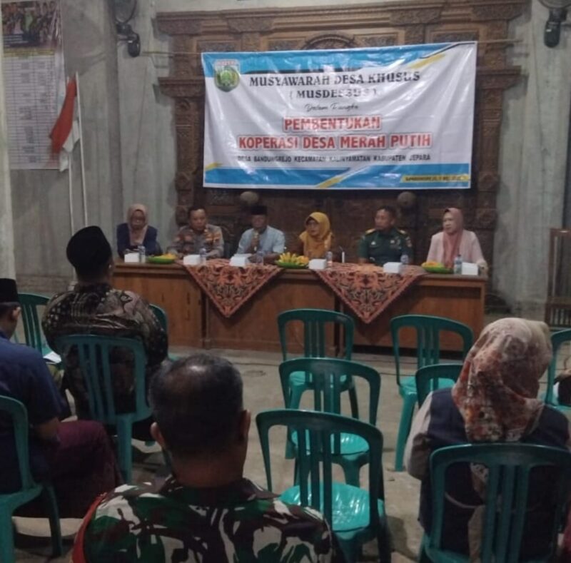 Jepara 6-5-2025– Kapten Cke Edi Susanto, Danramil 04/Pecangaan, Kodim 0729/Jepara, menghadiri kegiatan Musyawarah Desa Khusus (Musdesus) terkait pembahasan dan penetapan Koperasi Merah Putih yang digagas oleh Presiden RI, Bapak H. Prabowo Subianto. Acara ini berlangsung di Balai Desa Bandungrejo, Kecamatan Kalinyamatan, Kabupaten Jepara, Senin malam (5/5).
