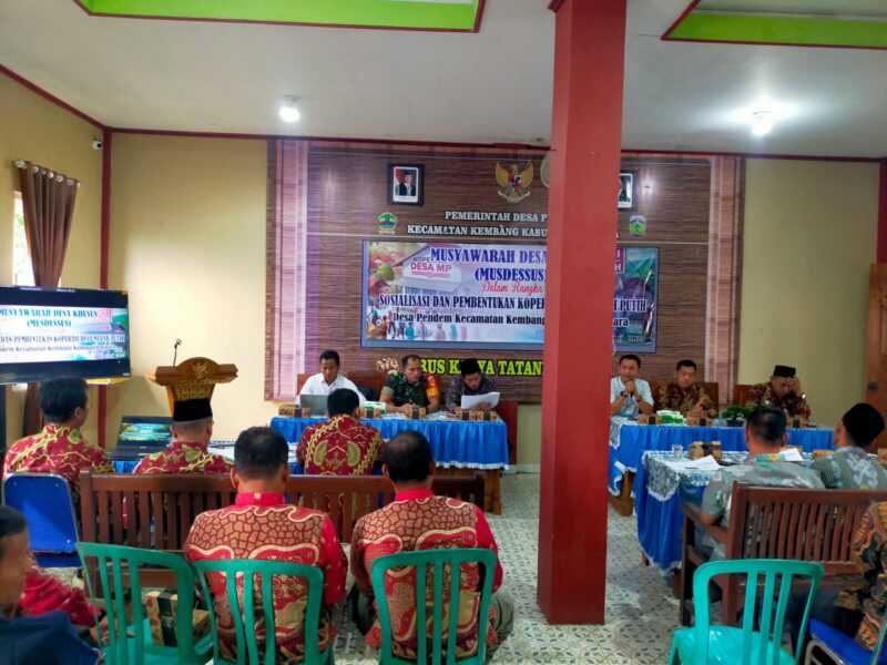 Jepara 9-5-2025– Dalam rangka memperkuat perekonomian desa berbasis gotong royong, Pemerintah Desa Pendem, Kecamatan Kembang, Kabupaten Jepara menggelar Musyawarah Desa Khusus (MUSDESSUS) dengan agenda Sosialisasi Pembentukan Koperasi Merah Putih. Kegiatan tersebut berlangsung di Balai Desa Pendem dan mendapat antusiasme tinggi dari seluruh elemen masyarakat.