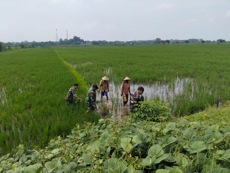 Dengan semangat gotong royong, para prajurit TNI turun langsung ke sawah bersama para petani, melakukan penyiangan rumput liar di sela-sela tanaman padi yang dapat mengganggu pertumbuhan dan hasil panen. Kehadiran Babinsa dan anggota Koramil disambut antusias oleh para petani yang merasa sangat terbantu, terlebih di musim tanam yang membutuhkan tenaga ekstra.