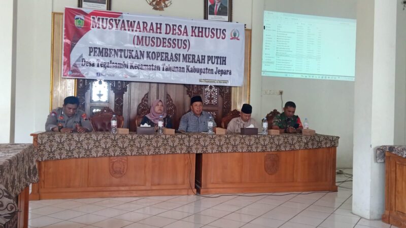 Jepara 9-5-2025 – Pemerintah Desa Tegalsambi, Kecamatan Tahunan, Kabupaten Jepara, menggelar Musyawarah Desa Khusus (Musdessus) dalam rangka pembentukan Koperasi Desa Merah Putih pada Kamis (9/05/2025) bertempat di Balai Desa Tegalsambi. Musyawarah ini menjadi langkah konkret dalam mendorong kemandirian dan kebangkitan ekonomi masyarakat berbasis potensi lokal.