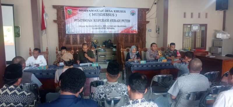 Jepara 9-5-205– Dalam rangka mendorong penguatan ekonomi masyarakat berbasis desa, Pemerintah Desa Sengonbugel, Kecamatan Mayong, Kabupaten Jepara, menggelar Musyawarah Desa Khusus (Musdessus) untuk membentuk Koperasi Desa Merah Putih, Kamis (9/05/2025). Babinsa Desa Sengonbugel, Kodim 0719/Jepara, Serka Samsul Ma’arif, turut hadir dalam kegiatan tersebut setelah sebelumnya melaksanakan pemantauan wilayah sebagai bagian dari tugas kewilayahan.