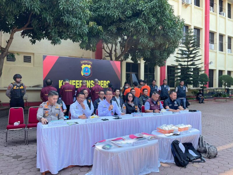 Medan – Direktorat Tindak Pidana Pelindungan Perempuan dan Anak serta Pemberantasan Perdagangan Orang (PPA & PPO) Bareskrim Polri bersama Ditreskrimum dan Ditresnarkoba Polda Sumatera Utara menggelar konferensi pers pengungkapan kasus Tindak Pidana Perdagangan Orang (TPPO) dan narkoba di halaman Mapolda Sumut, Kamis (19/6/2025).
