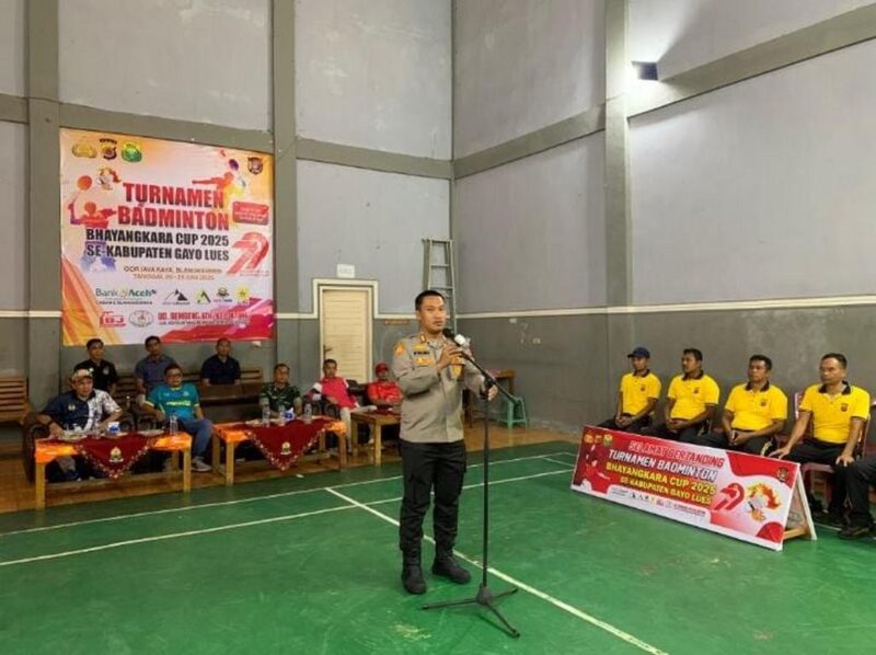 Blangkejeren | Dalam rangka menyambut Hari Bhayangkara ke-79 yang jatuh pada 1 Juli mendatang, Kepolisian Resor (Polres) Gayo Lues menyelenggarakan Turnamen Badminton Bhayangkara Cup tingkat kabupaten. Kegiatan pembukaan turnamen ini digelar dengan penuh semangat dan secara resmi dibuka oleh Kapolres Gayo Lues AKBP Hyrowo, S.I.K., di Gedung Olahraga (GOR) Gayo Lues, Kecamatan Blangkejeren, Kabupaten Gayo Lues, Jumat sore, 20 Juni 2025.