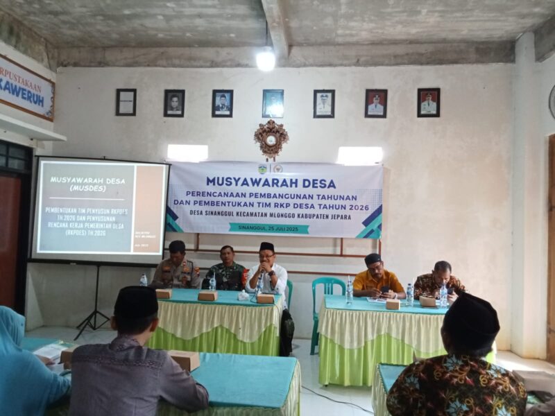Jepara, 25 Juli 2025 — Dalam rangka mendukung transparansi dan perencanaan pembangunan desa, Babinsa Desa Sinanggul Serda Juri, anggota Koramil 09/Mlonggo Kodim 0719/Jepara, menghadiri Musyawarah Desa (Musdes) Penyusunan Rencana Kerja Pemerintah Desa (RKPDes) Tahun Anggaran 2026 yang digelar di Balai Desa Sinanggul, Kecamatan Mlonggo, Kabupaten Jepara, Jumat (25/7).