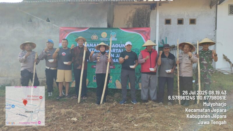 Dalam rangka mendukung program ketahanan pangan nasional, Babinsa Desa Mulyoharjo, Serda Suhartono dari Koramil 01/Jepara, Kodim 0719/Jepara, bersama anggota Polsek Jepara Kota melaksanakan kegiatan penanaman jagung pada kwartal III tahun 2025. Penanaman dilakukan di lahan perhutanan sosial yang berada di wilayah Desa Mulyoharjo, Kecamatan Jepara.