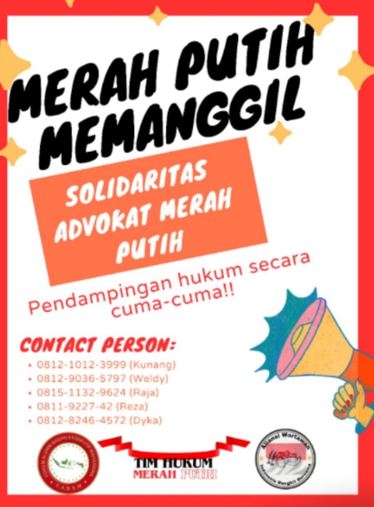 Team Hukum Merah Putih beserta Aliansi Wartawan Indonesia Bangkit Bersama (AWIBB) dan FABEM (Forum Alumni Badan Eksekutif Mahasiswa ) sepakat membentuk team advokasi guna membantu adik – adik mahasiswa beserta para ojol yang menjadi korban penangkapan akibat melakukan demonstrasi di Depan Gedung DPR RI.