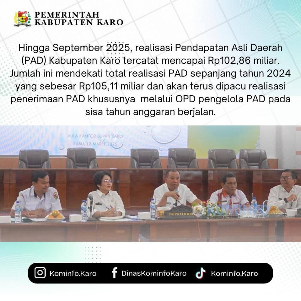 RadarNews.Nasional.com,Kabupaten Karo — Hingga September 2025, realisasi Pendapatan Asli Daerah (PAD) Kabupaten Karo tercatat mencapai Rp102,86 miliar. Jumlah ini mendekati total realisasi PAD sepanjang tahun 2024 yang sebesar Rp105,11 miliar dan akan terus dipacu realisasi penerimaan PAD khususnya melalui OPD pengelola PAD pada sisa tahun anggaran berjalan.