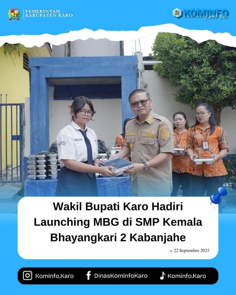 RadarNews.Nasional.com,Kabupaten Karo – Wakil Bupati Karo, Komando Tarigan,SP, hadiri launching program Makan Bergizi Gratis (MBG) di SMP Kemala Bhayangkari 2 Kabanjahe, Senin (22/09/2025). Bersama Kapolres Tanah Karo AKBP Eko Yulianto, perwakilan Kejari, perwakilan Kodim 0205 dan Badan Gizi Nasional , Wakil Bupati Karo berkesempatan memberikan secara simbolis paket perdana makan bergizi kepada para siswa.