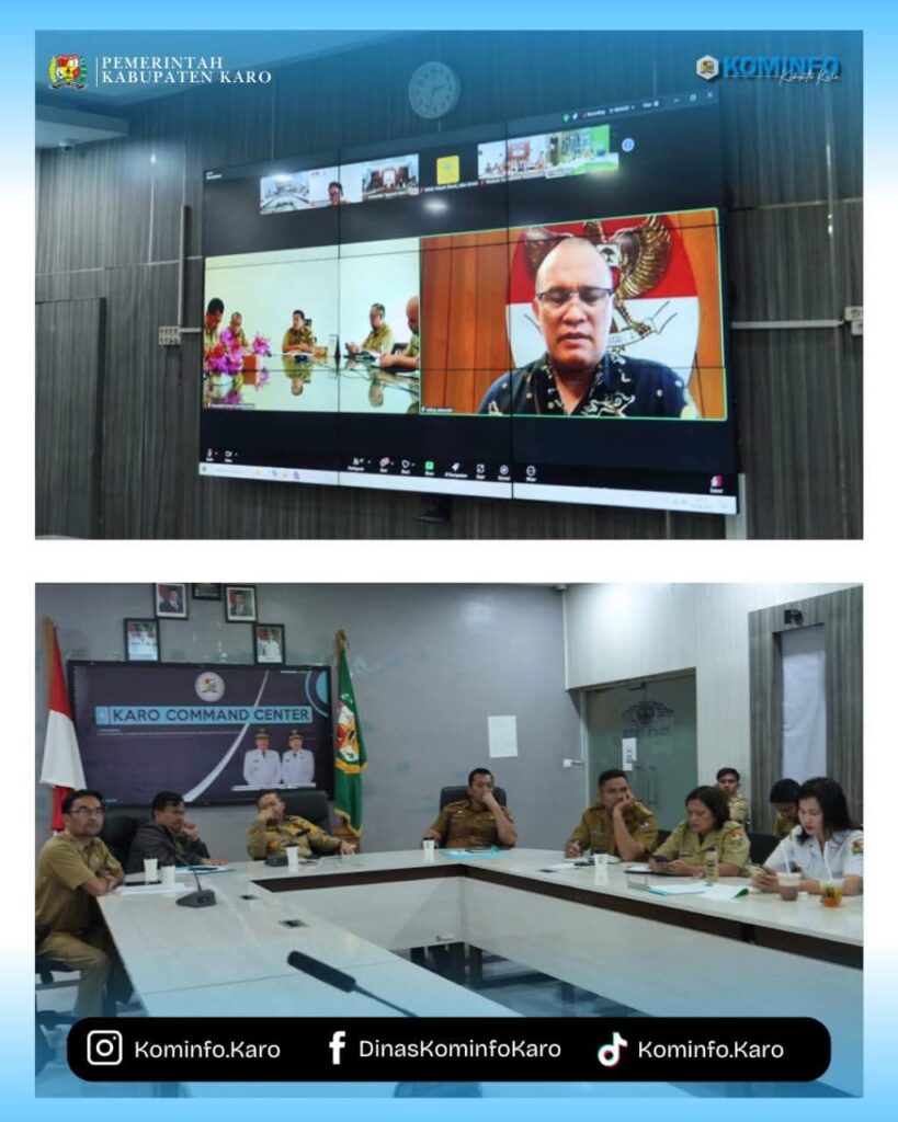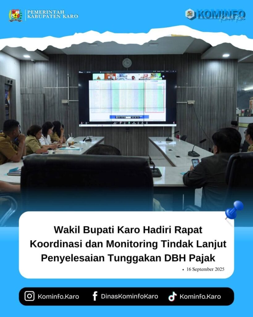 RadarNews.Nasional.com,Kabupaten Karo – Wakil Bupati Karo, Komando Tarigan, SP., didampingi oleh Sekda Kab.Karo, Gelora Kurnia Putra Ginting, S.STP., MM., menghadiri rapat koordinasi dan monitoring tindak lanjut penyelesaian tunggakan dana bagi hasil (DBH) pajak bagian pemerintah kabupaten/kota di wilayah sumatera utara yang dilakukan secara Zoom Meeting di Ruang KCC Kantor Bupati Karo pada Selasa (16/09/2025)