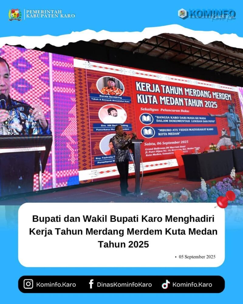 Kerja Tahun merupakan Perayaan adat Karo yang dilaksanakan setiap tahunnya, namun Kerja Tahun Merdang Merdem Kuta Medan Tahun 2025 kali ini diiringi dengan momentum peluncuran serta bedah buku “Bangsa Karo dari Masa ke Masa dalam Dokumentasi Lukisan dan Foto” karya Roy Fachraby Ginting, SH, MKn., dan Dr. Bakhrul Khair Amal, M.Si.