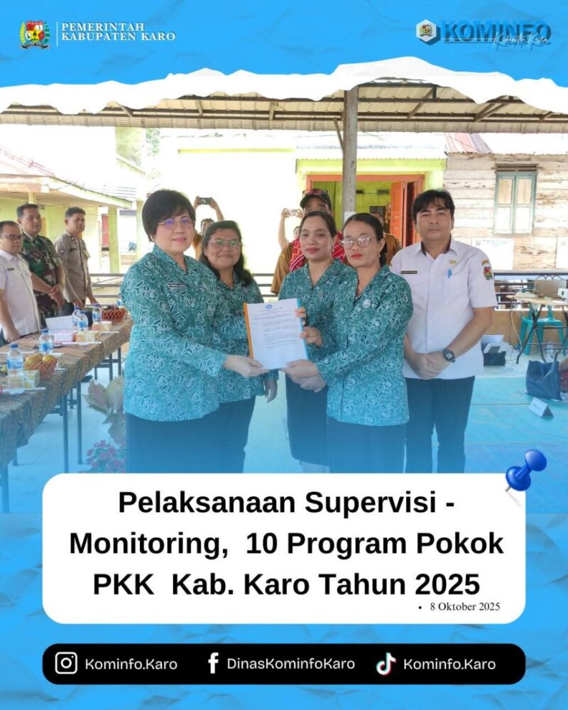 RadarNews.Nasional.com,Kabupaten Karo-Ketua Tim Penggerak PKK Kabupaten Karo, Ny. Roswitha Antonius Ginting, bersama Tim Supervisi melaksanakan kegiatan monitoring dan supervisi lomba Desa Percontohan Pelaksana 10 Program Pokok PKK Tahun 2025 di Desa Jandi, Kecamatan Juhar, dan Desa Kutabangun, Kecamatan Tigabinanga, Rabu (08/10/2025).