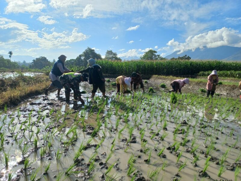 Gayo Lues – Babinsa Koramil 08/Blangpegayon Serda Zali Mahendra melaksanakan pendampingan menanam padi, di Desa Cinta Maju, Kecamatan Blangpegayon, Kabupaten Gayo Lues, Senin (13/10/2025).