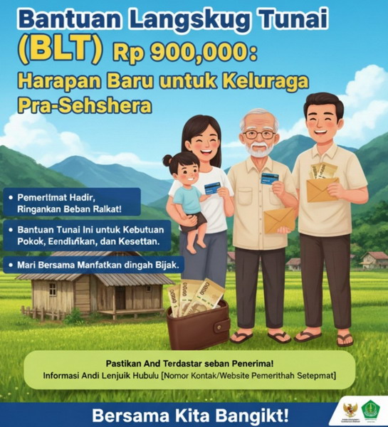 JAKARTA — Pemerintah kembali menyalurkan Bantuan Langsung Tunai (BLT) sebesar Rp 900.000 bagi keluarga berpenghasilan rendah sebagai bagian dari upaya menjaga ketahanan ekonomi masyarakat di tengah tekanan situasi ekonomi global. Penyaluran bantuan dilakukan satu kali untuk periode Oktober hingga Desember 2025 dengan total bantuan senilai Rp 900.000 per keluarga, atau setara Rp 300.000 per bulan.