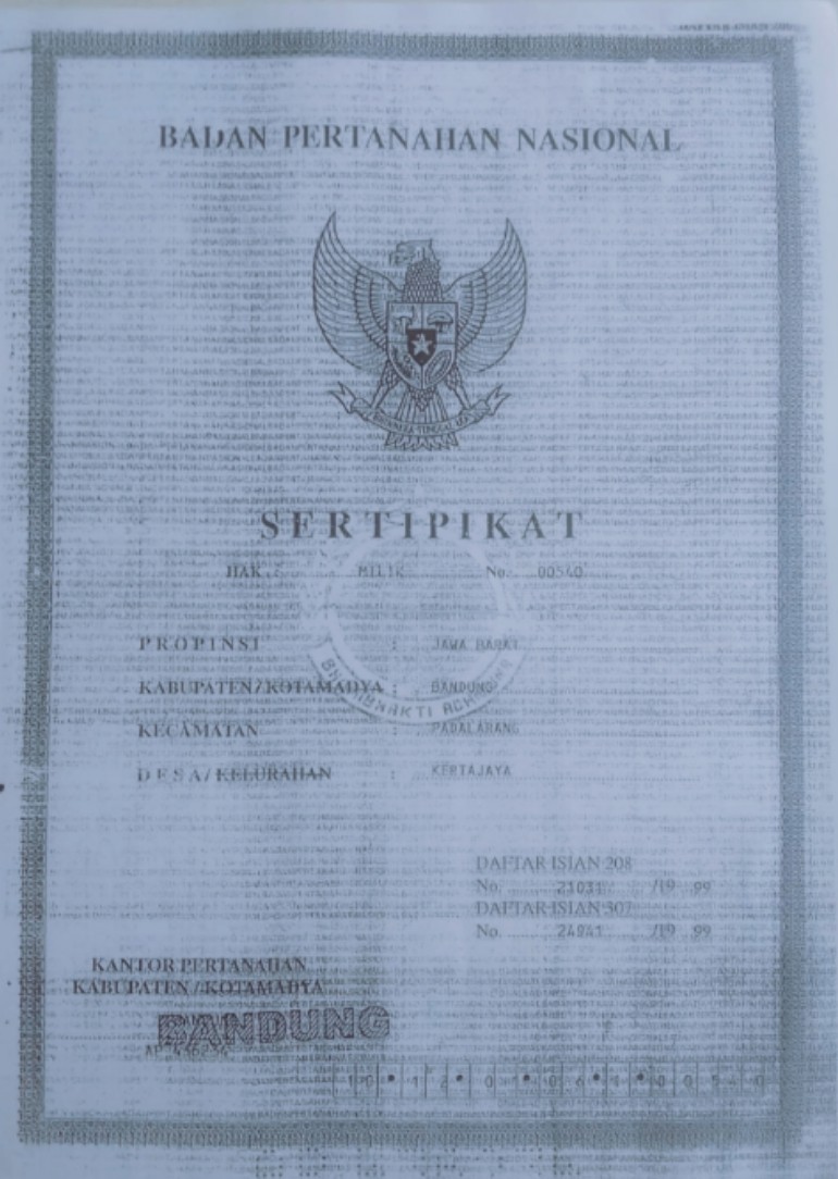Padalarang, Bandung Barat — Sertipikat Hak Milik (SHM) atas sebidang tanah di wilayah Desa Kertajaya, Kecamatan Padalarang, Kabupaten Bandung Barat dilaporkan hilang. Kehilangan tersebut telah dilaporkan secara resmi ke pihak kepolisian dan ditindaklanjuti oleh Kantor Pertanahan (BPN) Kabupaten Bandung Barat dengan menerbitkan pengumuman sertipikat hilang.
