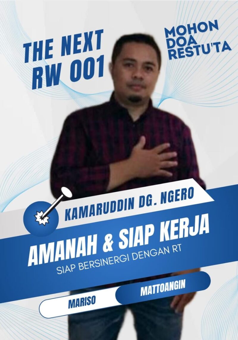 “Saya siap maju bertarung menjadi ketua RW karena amanah dan dorongan dari masyarakat,” tegas Kamaruddin Dg Ngero. “Saya siap membantu para pedagang kecil, selalu memperhatikan warga dalam hal kesehatan, pengurusan surat-surat, serta menjaga keamanan lingkungan.”