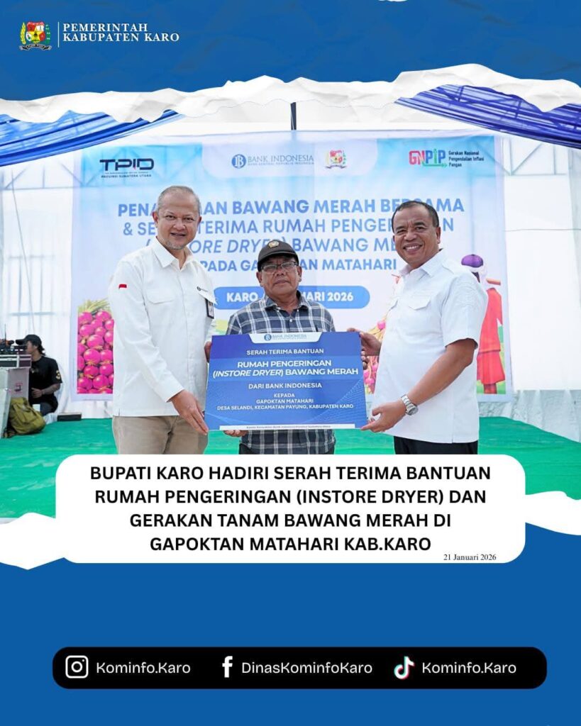 RadarNews.Nasional.com,Kabupaten Karo – Bupati Karo, Brigjen Pol (Purn) Dr.dr. Antonius Ginting, Sp.OG., M.Kes, menghadiri acara seremoni serah terima bantuan Instore Dryer (Rumah Pengering) dan Gerakan Penanaman Bawang Merah yang dipusatkan di Desa Selandi, Kecamatan Payung, Rabu (21/01/2026).