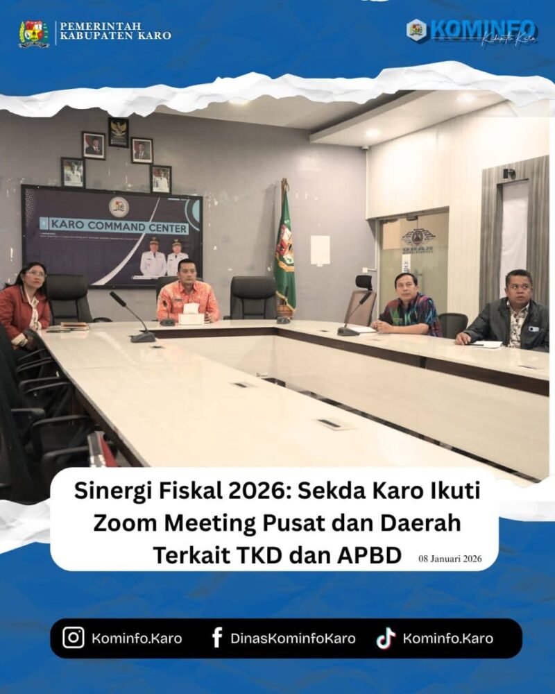 RadarNews.Nasional.com,Kabupaten Karo – Pemerintah Kabupaten Karo terus memperkuat koordinasi dengan pemerintah pusat guna memastikan pengelolaan keuangan daerah yang akuntabel dan sinkron dengan kebijakan nasional. Hal ini ditegaskan oleh Bupati Karo Brigjen Pol (Purn) Dr.dr. Antonius Ginting, Sp.OG., M.Kes melalui Sekretaris Daerah (Sekda) Kabupaten Karo, Gelora Kurnia Putra Ginting, S.STP, MM, saat mengikuti rapat virtual (Zoom Meeting) mengenai Sinergi Fiskal Pusat dan Daerah, Kamis (08/01/2026).