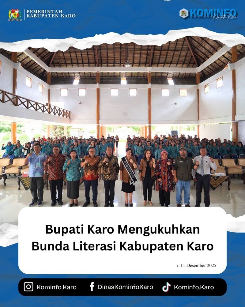 RadarNews.Nasional.com,Kabupaten Karo – Bupati Karo, Brigjen Pol (Purn) Dr. dr. Antonius Ginting, Sp.OG., M.Kes., didampingi Wakil Bupati Karo, Komando Tarigan, SP., Sekda Kab.Karo, Gelora Kurnia Putra Ginting, S.STP., MM., dan Bunda PAUD mengukuhkan Bunda Literasi Kabupaten Karo kepada Ketua TP PKK Kab. Karo, Ny Roswitha Antonius Ginting yang dilaksanakan di Pendopo Rumah Dinas Bupati Karo pada Kamis (11/12).