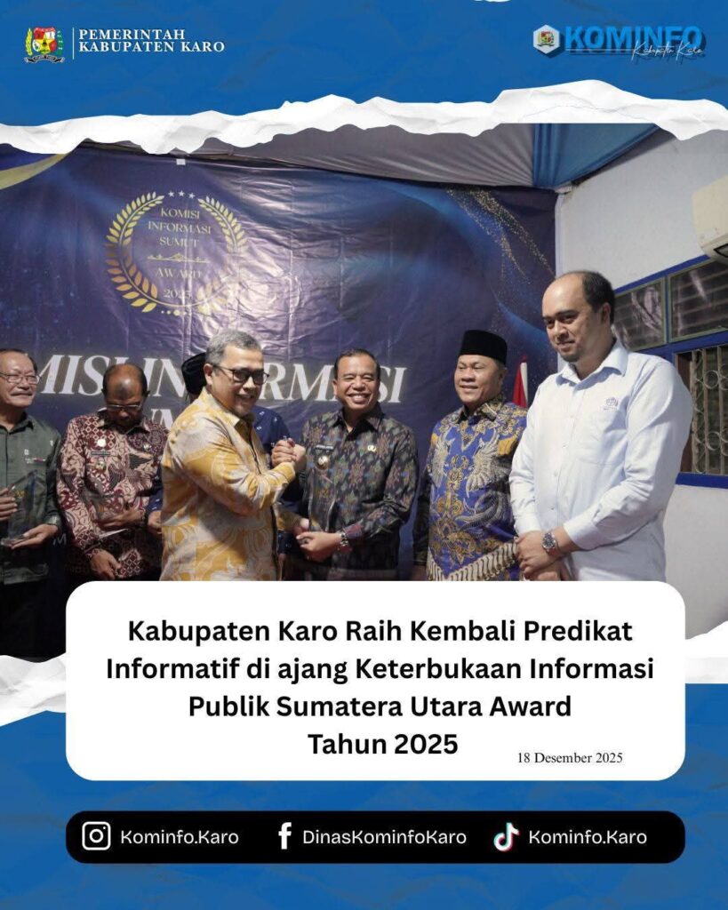 RadarNews.Nasional.com,Kabupaten Karo – Pemerintah Kabupaten Karo kembali menorehkan prestasi membanggakan dengan meraih Anugerah Keterbukaan Informasi Badan Publik Tahun 2025 sebagai Badan Publik Informatif pada ajang Keterbukaan Informasi Publik Sumatera Utara Awards (KIA) Tahun 2025. Penghargaan tersebut diserahkan langsung Oleh Gubernur Sumatera Utara melalui Staf Ahli Gubernur Alfi Syahriza, kepada Bupati Karo,Brigjen Pol( Purn.)Dr dr. Antonius Ginting,Sp.OG.,M.Kes didampingi Ketua Komisi Informasi Provinsi Sumatera Utara Dr. Abdul Harris Nasution,SH., M.Kn.