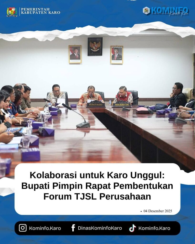 RadarNews.Nasional.com,Kabupaten Karo – Bupati Karo, Brigjen Pol (Purn) Dr. dr. Antonius Ginting, Sp.OG., M.Kes., didampingi Wakil Bupati Karo, Komando Tarigan, SP., dan Plt. Kepala Bappedalitbang Kab. Karo, Abel Tarwai Tarigan, S.Sos, MT., pimpin Rapat Koordinasi Pembentukan Forum Tanggung Jawab Sosial dan Lingkungan (TJSL) Perusahaan di Ruang Rapat Bupati Karo pada Kamis (04/12/2025)