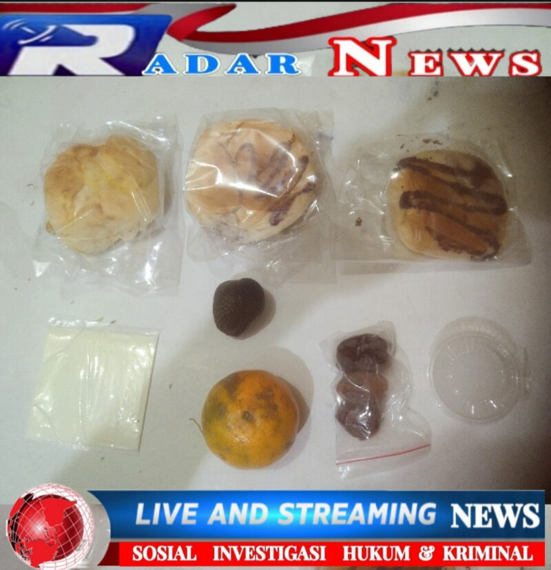 menunjukkan isi paket yang dinilai jauh dari standar “bergizi”: tiga potong roti kemasan, 3. butir kurma dalam plastik kecil, 1 Salak, 1 jeruk dengan kondisi kurang segar, satu sachet cairan putih yang diduga Keju setipis kartu ATM, serta 1wadah plastik bulat kecil yg berisi selai.