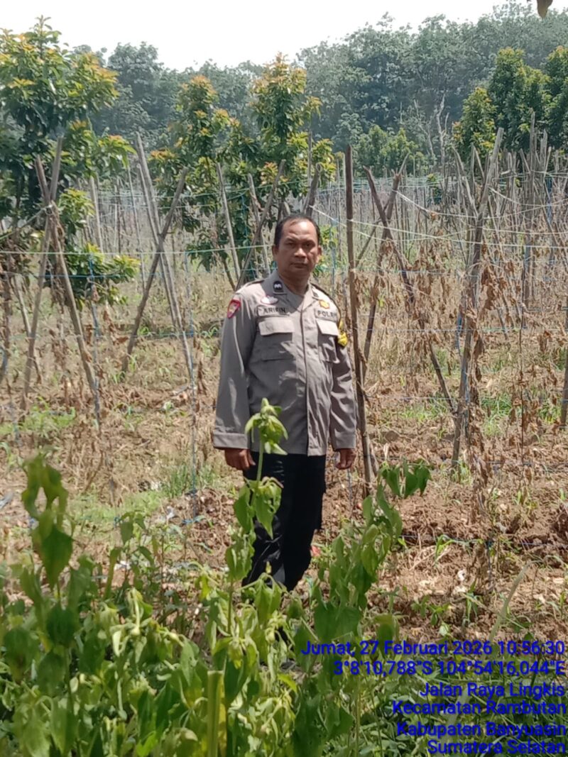 Banyuasin – Dalam upaya mendukung program pemerintah mewujudkan ketahanan pangan menuju Indonesia Emas 2045, Bhabinkamtibmas Polsek Rambutan, Aipda Arifin Ahmad, SH, gencar melakukan pendampingan kepada masyarakat. Jumat pagi (27/2/2026) sejak pukul 13.00 WIB, ia turun langsung ke lahan pekarangan warga di Desa Tanah Lembak, Kecamatan Rambutan, Kabupaten Banyuasin.