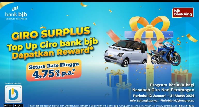 Sebagai bagian dari komitmen dalam mendukung pengelolaan keuangan nasabah korporasi, bank bjb memperkenalkan Program Giro Surplus. Program ini ditujukan bagi nasabah giro non perorangan dan berlangsung pada 12 Januari sampai dengan 31 Maret 2026.