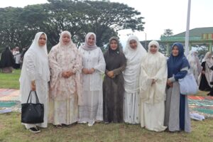 Turut mendampingi dalam kegiatan ibadah tahunan ini, Ketua Persit Kartika Chandra Kirana (KCK) Cabang XXVI Dim 0113 Koorcab Rem 011 PD Iskandar Muda, Ny. Dhantie Fran, yang juga melaksanakan Sholat Ied bersama jajaran Ibu-ibu Forkopimda.