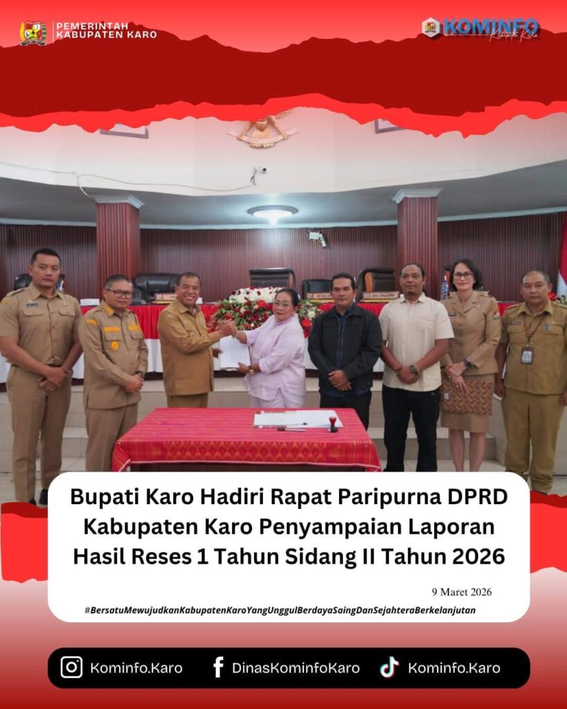 RadarNews.Nasional.com,Kabupaten Karo – Bupati Karo, Brigjen Pol (Purn) Dr. dr. Antonius Ginting, Sp.OG., M.Kes., didampingi Wakil Bupati Karo, Komando Tarigan, SP, Sekda Kab.Karo, Gelora Kurnia Putra Ginting, S.STP., MM., menghadiri Rapat Paripurna Dewan Perwakilan Rakyat Daerah (DPRD) Kabupaten Karo Penyampaian Laporan Hasil Reses 1 Tahun Sidang II Tahun 2026 yang dilaksanakan di Kantor DPRD Kabupaten Karo. Senin (9/3/2026).