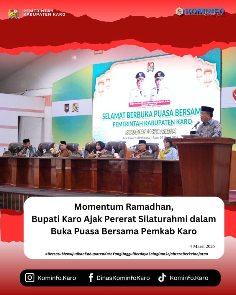 RadarNews.Nasional.com,Kabupaten Karo – Bupati Karo, Brigjen Pol (Purn) Dr. dr. Antonius Ginting, Sp.OG., M.Kes., menghadiri Acara Buka Puasa Bersama Pemerintah Kabupaten Karo pada Bulan Suci Ramadhan 1447 H yang dilaksanakan di Aula Rakoetta Brahmana, Kantor Bupati Karo, pada Rabu (4/3/2026).