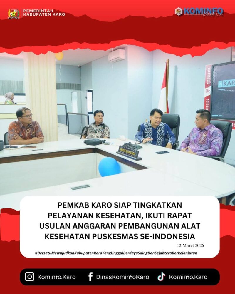 RadarNews.Nasional.com,Kabupaten Karo -( 12 Maret 2026) , Bupati Karo Bupati Karo, Brigjen Pol (Purn) Dr. dr. Antonius Ginting, Sp. OG., M.Kes, melalui Sekretaris Daerah Kabupaten Karo Gelora Kurnia Putra Ginting, S.STP, MM hadiri rapat daring Usulan Anggaran Pembangunan dan Penyediaan Alat Kesehatan Puskesmas se-Indonesia yang dilaksanakan oleh Dinas Kesehatan Provinsi Sumatera Utara bertempat di ruang KCC Kantor Bupati Karo.