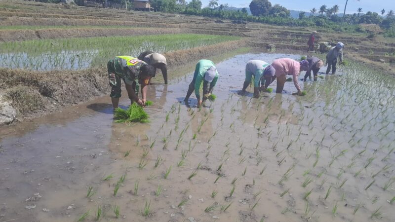 Gayo Lues – Babinsa Koramil 08/Blangpegayon Sertu M. Ali melaksanakan pendampingan menanam padi, di Desa Tetinggi, Kecamatan Blangpegayon, Kabupaten Gayo Lues, Selasa (07/04/2026).