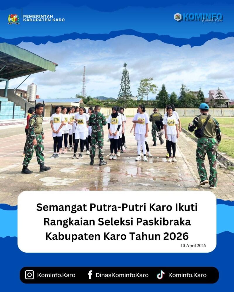 RadarNews.Nasional.com,Kabupaten Karo – Pemerintah Kabupaten Karo melaksanakan rangkaian Seleksi Calon Pasukan Pengibar Bendera Pusaka (Paskibraka) Kabupaten Karo Tahun 2026 yang dimulai dengan Seleksi Kesamaptaan pada Kamis (09/04/2026) di Stadion Bola Kaki Samura, Kabanjahe, serta dilanjutkan dengan Seleksi Kepribadian dan Wawancara pada Jumat (10/04/2026) di Aula Rakoetta Brahmana Kantor Bupati Karo. Kegiatan ini menjadi bagian penting dalam menjaring putra-putri terbaik Kabupaten Karo yang akan bertugas pada upacara peringatan Hari Kemerdekaan Republik Indonesia Tahun 2026.