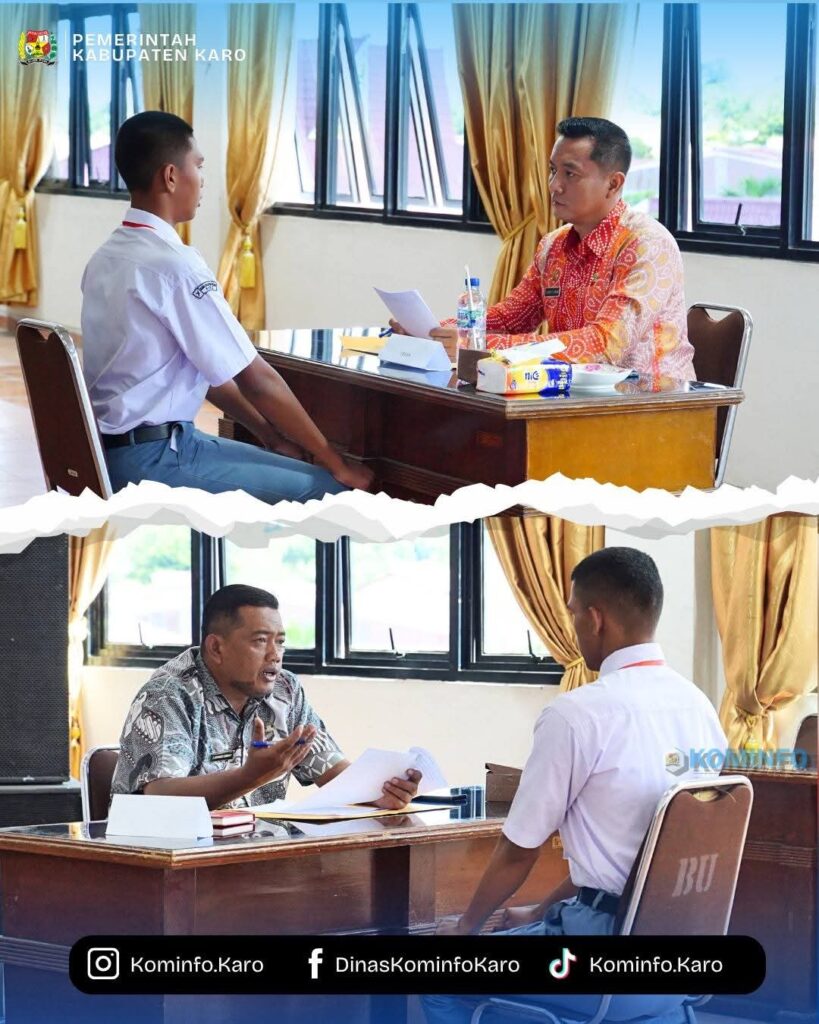 Rangkaian seleksi kemudian dilanjutkan dengan Seleksi Kepribadian dan Wawancara yang dilaksanakan pada Jumat (10/04/2026) di Aula Rakoetta Brahmana Kantor Bupati Karo. Proses wawancara dilakukan oleh Sekretaris Daerah Kabupaten Karo, Gelora Kurnia Putra Ginting, S.STP., M.M., Staf Ahli Bupati Karo Bidang Politik dan Pemerintahan, Frans Leonardo Surbakti, S.STP., Asisten Pemerintahan dan Kesejahteraan Rakyat Setda Kabupaten Karo, Dr. Drs. Eddi Surianta, M.Pd., Kepala Badan Kesbangpol Kabupaten Karo, Gelora Fajar Purba, S.H., M.H., serta Sekretaris Dinas Pendidikan Kabupaten Karo, Daut Sembiring, S.STP., MSP.